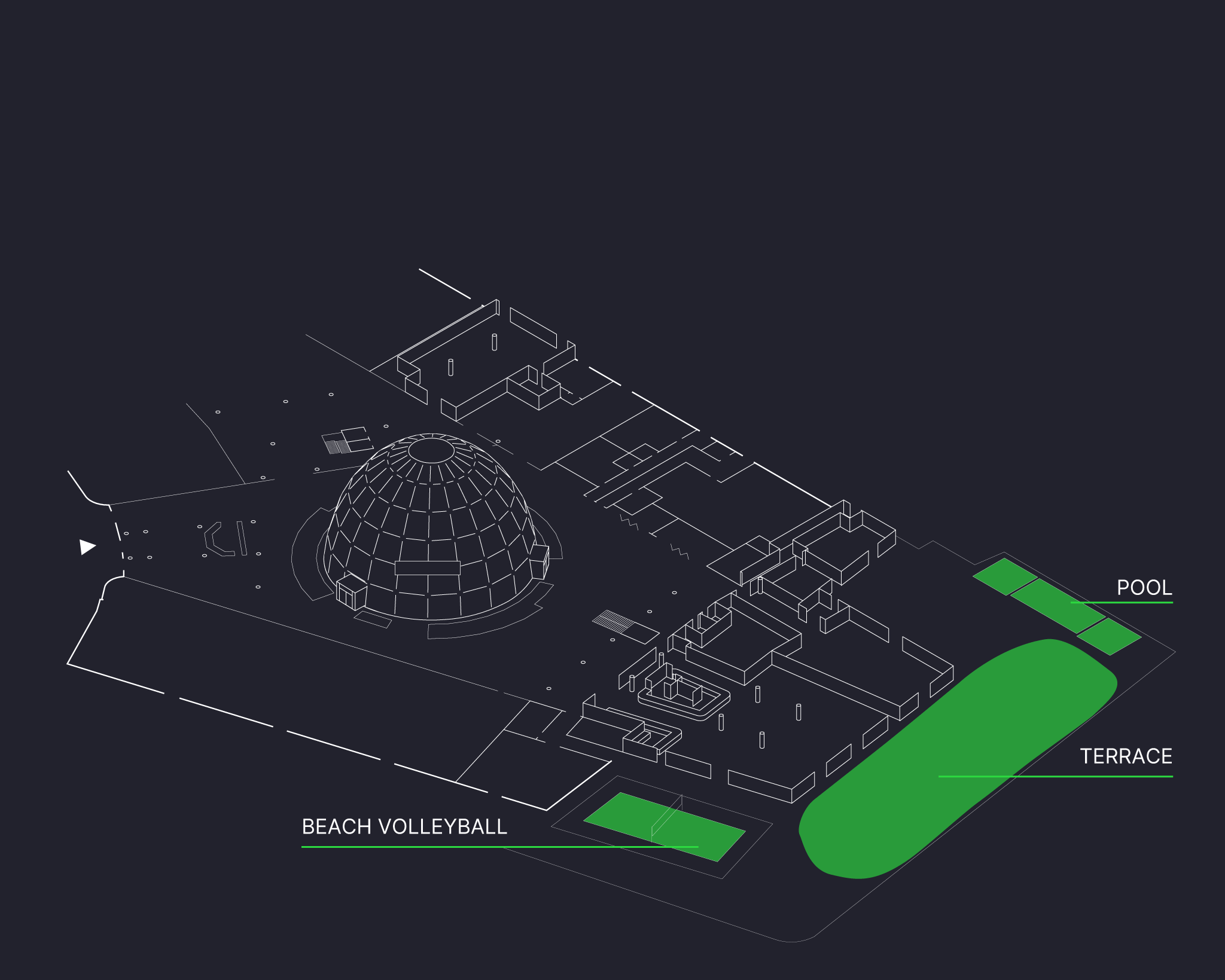 Terrace, pool and beach volleyball court